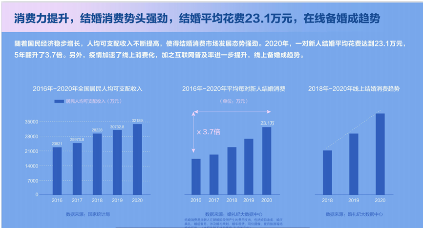 同時(shí),疫情背景下數字技術(shù)和應用的不斷普及和優(yōu)化,也給婚慶行業(yè)帶來(lái)了新的模式轉型契機,以互聯(lián)網(wǎng)婚慶為代表的線(xiàn)上婚禮形態(tài)多元,數字化婚禮趨勢日益清晰。