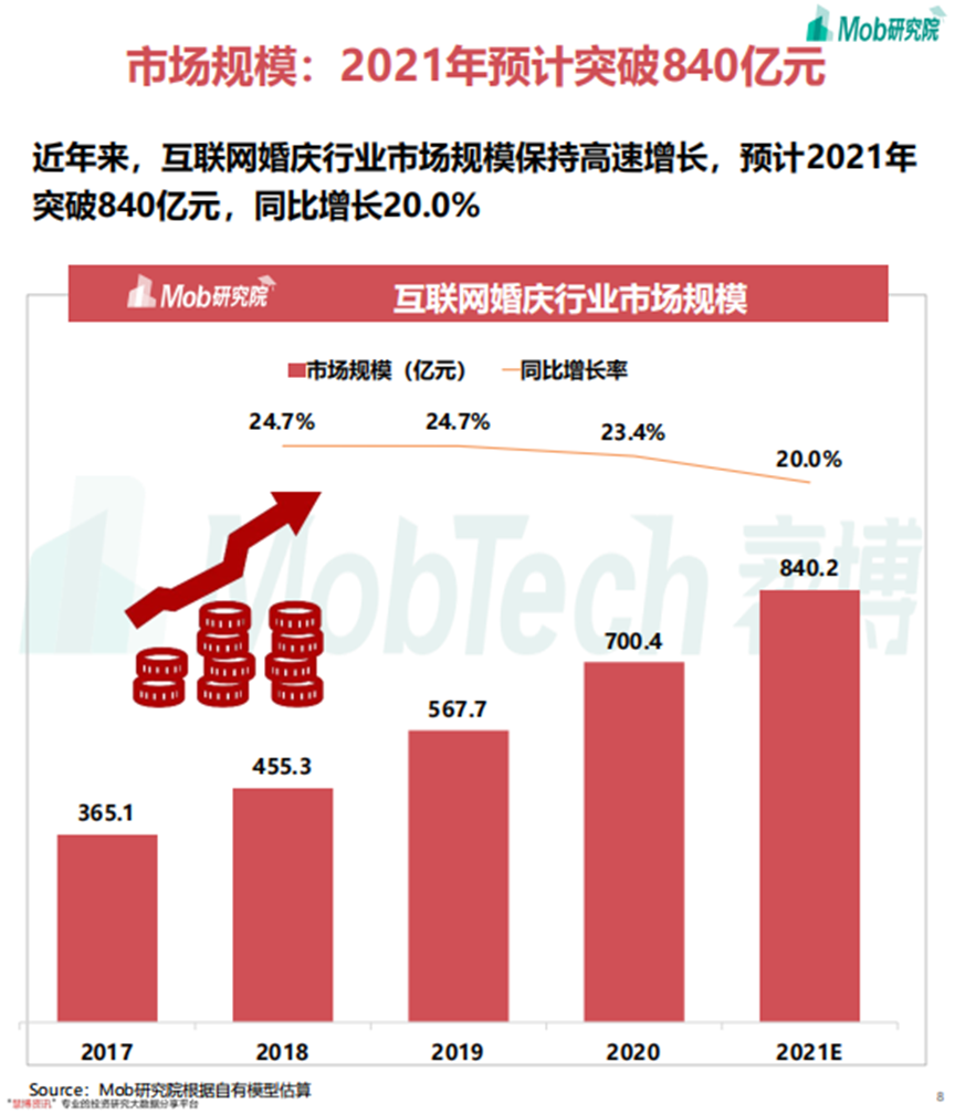 據艾媒咨詢(xún)報告分析,目前中國20-40歲的適婚人口總量約為4.47億人,大量的適婚人口,為中國婚慶市場(chǎng)增加了潛在客戶(hù)。而隨著(zhù)居民收入的增加和生活品質(zhì)的提高,婚慶質(zhì)量要求逐年上升,形式趨于多樣化,形成了巨大的增量市場(chǎng)。