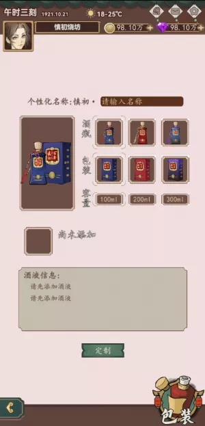 在游戲中,玩家也可根據不同的系統任務(wù)及任務(wù)完成度獲得相應物資,充分滿(mǎn)足玩家的各階段的物品需求。除了在體驗實(shí)現白酒的釀造過(guò)程之外,還可以通過(guò)調酒及個(gè)性化包裝,完成整個(gè)成品酒的制作過(guò)程。玩家也可進(jìn)行酒的自定義起名、捏酒瓶、定制包裝盒,從包裝上實(shí)現個(gè)性化狀態(tài)。