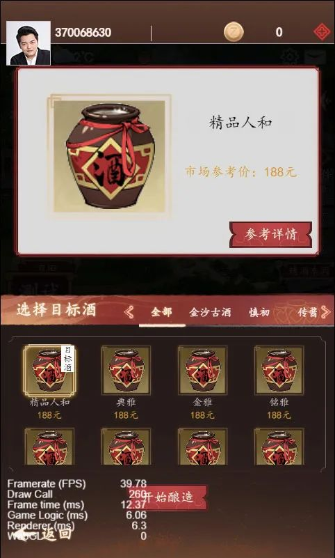 初釀酒時(shí),用戶(hù)可以根據選酒系統的設定,選定當前階段釀酒的目標酒液,有官方酒和自定義酒兩個(gè)大類(lèi)選項。官方酒會(huì )展示酒液的當前市場(chǎng)零售價(jià)及釀造所需的原料數量,選定目標酒后,同時(shí)生成釀造引導list,指引用戶(hù)至原料生產(chǎn)建筑。選擇自定義模式用戶(hù)可根據釀酒經(jīng)驗,自由生產(chǎn)各個(gè)階段的釀造原料,根據年份酒的個(gè)性化搭配,獲得定制酒液。