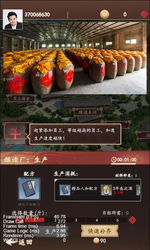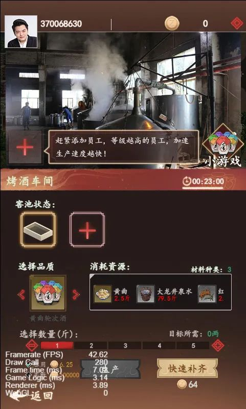 在釀造生產(chǎn)過(guò)程中,用戶(hù)也可通過(guò)界面內設置的踩曲小游戲和車(chē)間設置的烤酒小游戲,根據在倒計時(shí)10秒內的踩曲次數,獲得對應制曲產(chǎn)量加成,在10秒倒計時(shí)內操控指針擺到黃色的判定位置,可獲得烤酒產(chǎn)量加成。同時(shí)烤酒車(chē)間特開(kāi)辟窖池***能,用戶(hù)可以進(jìn)行租賃或購買(mǎi),滿(mǎn)足用戶(hù)同時(shí)多窖池生產(chǎn)需求,提高生產(chǎn)效率,購買(mǎi)的窖池在現實(shí)中對應獲得。整個(gè)過(guò)程極具人性化,且極富趣味性。